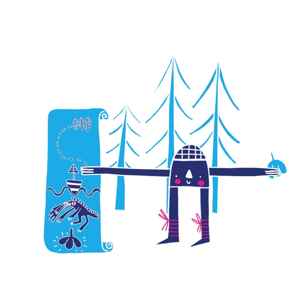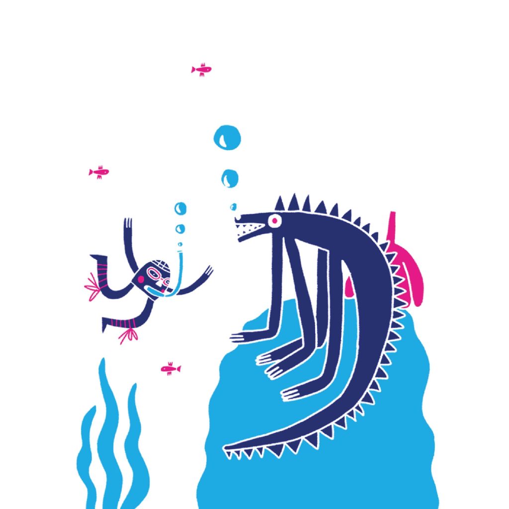 A series of graphic spot illustrations exploring narrative through a strict three-color palette (cyan, navy, and magenta). This project utilizes flat, geometric shape language and cut-out silhouettes to tell a whimsical story of friendship between a tiny explorer and a sea beast. The style draws inspiration from folk art and risograph printing techniques.